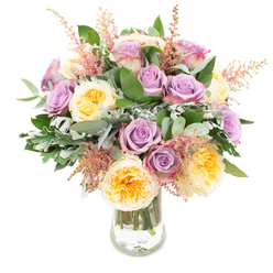 This wonderful arrangement is bursting with blue hydrangeas, light purple roses, green lisianthus, white spray roses, Ammi visnaga, pink bouvardia and pink astilbe to create a magical combination that will make a great impression! A very stylish gift that you can send to your family and friends!