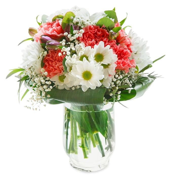 Our Luminous Charm Bouquet radiates beauty and uniqueness with a stunning combination of snow-white chrysanthemums, delicate gypsophila, soft light pink carnations, and vibrant aspidistra leaves.