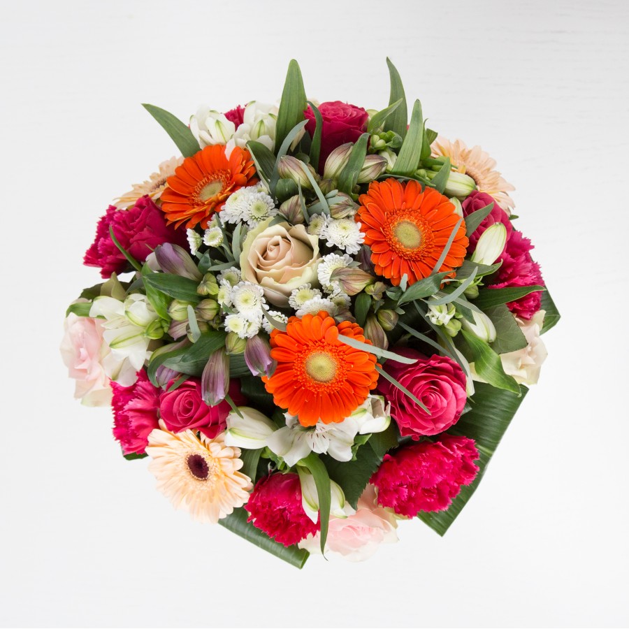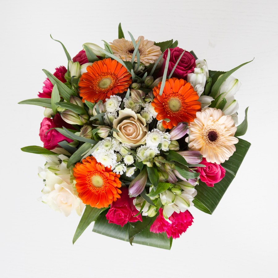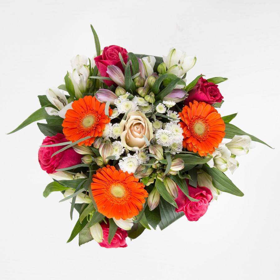 Embrace the radiance of spring with our Handcrafted Spring Radiance Bouquet. This unique arrangement blends rich orange germini, soft pink roses, and pristine white alstroemeria for a stunning presentation.